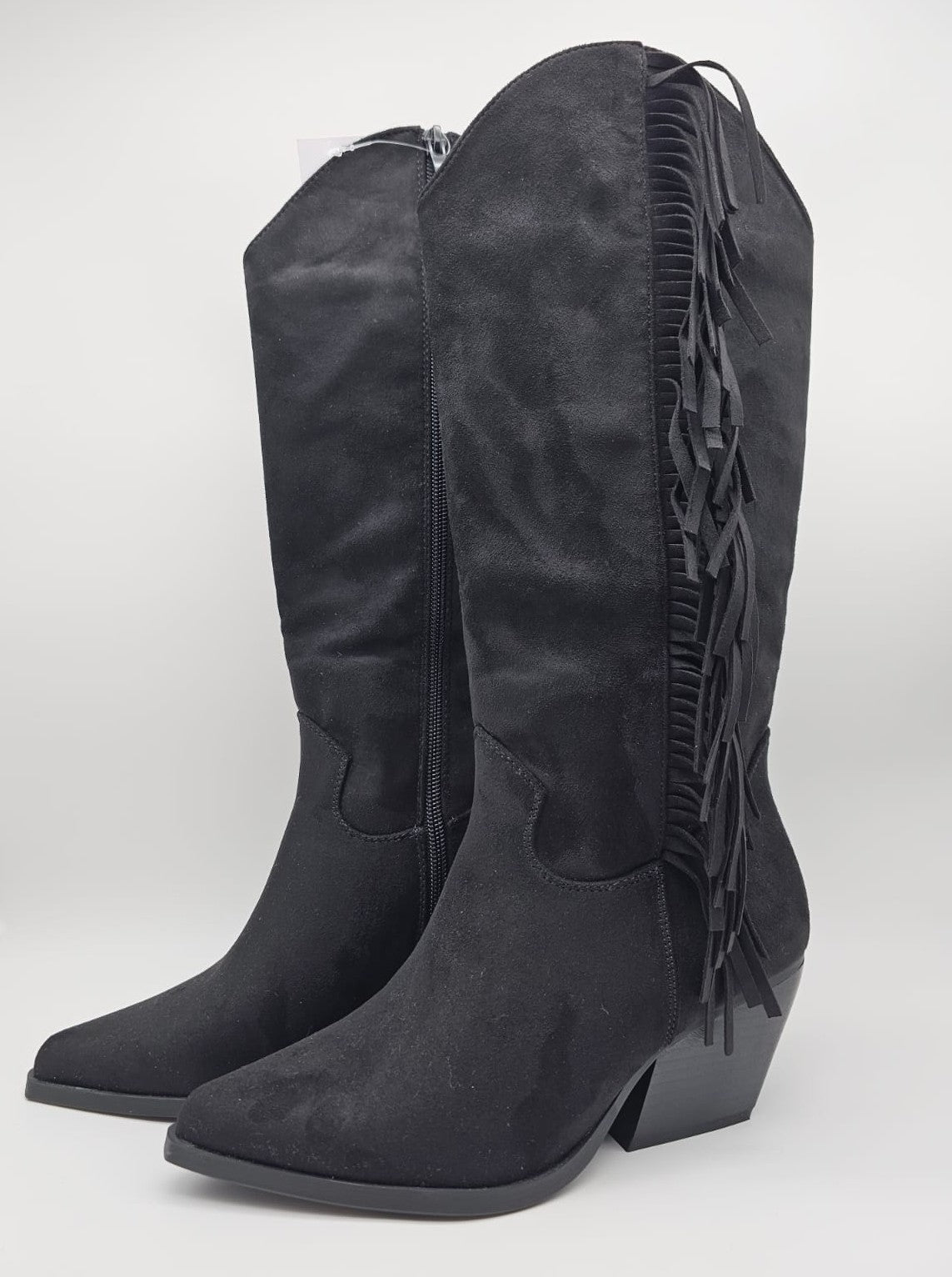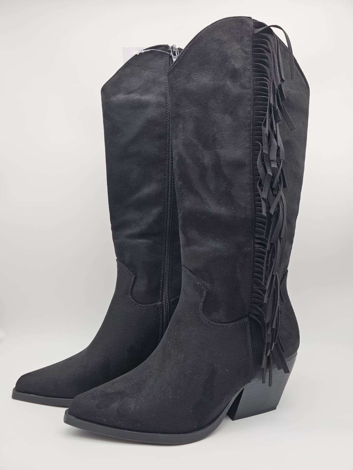 Santiags hautes noires en velours à franges, avec un talon de 5 cm.